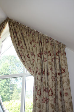![]() These Full-length Interlined Dress Curtains together with a straight Upholstered pelmet complement these paisley Roman Blinds to dress this elegant Dining Room Bay window in Bowdon | ![]() | ![]() Handmade twin pleat headings ensure that curtains can be dressed to hang in perfect pleats. |