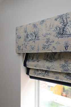 ![]() Decorative buttons across the lower edge of a roman blind can make a fun feature on a plain blind! | ![]() The addition of fringing, decorative braids, beads or pom pom trims across the lower edge of roman blinds can transform a plain blind or highlight a colour in your fabric to give it the wow factor! | ![]() This fun black and white fabric featuring streets of houses echoes the view from the window in this study in Hale! |