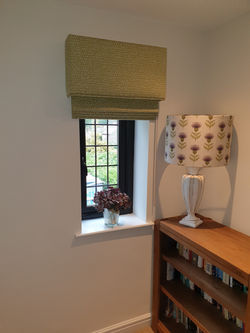![]() Villa Nova floral fabric on the roman blinds and curtains in Living Kitchen in Bowdon links the room with the garden. | ![]() | ![]() Landing Roman Blind fitted outside the window reveal with matching upholstered piped pelmet. |